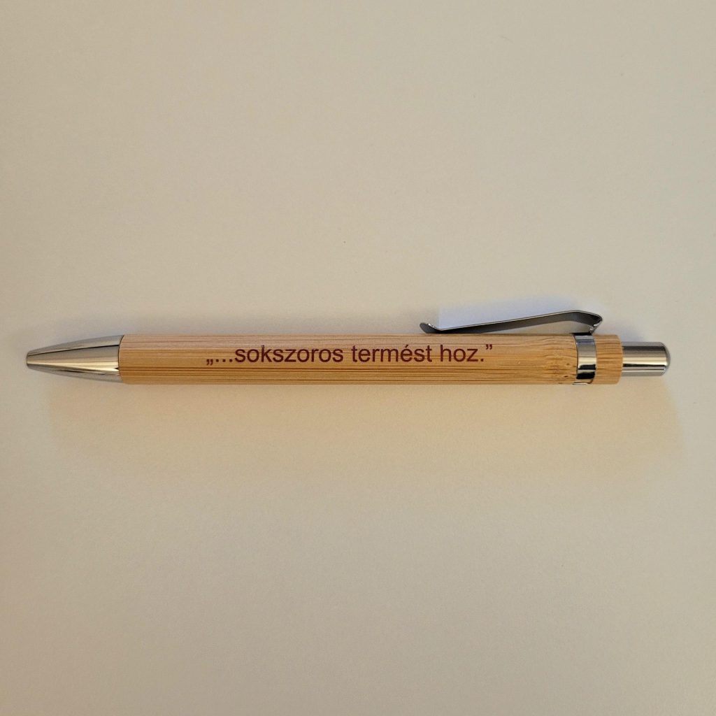 Elegáns, természetes fa borítású golyóstoll a „…sokszoros termést hoz.” felirattal, amely Boldog Bódi Mária Magdolna egyik legismertebb gondolatára utal.